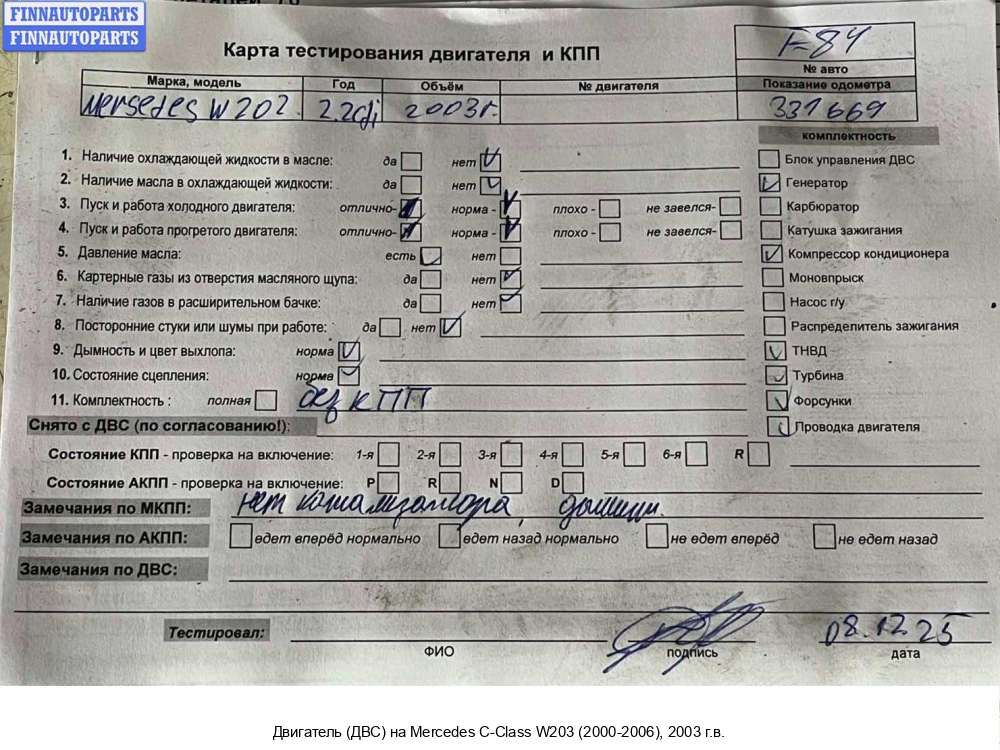 2003; Дизель; 2.2; OM 646.962, CDI; Седан; ; серебристый; 2003, 2.2л, Дизель, CDI, OM 646.962, 64696230109996, Седан, серебристый, 64696230109996 | - | Г | К | С | Н | КК | ТУ, прокручивается, состояние ГРМ - нормально, поддон - нормально, клапанная крышка - нормально, эмульсия -нет.,